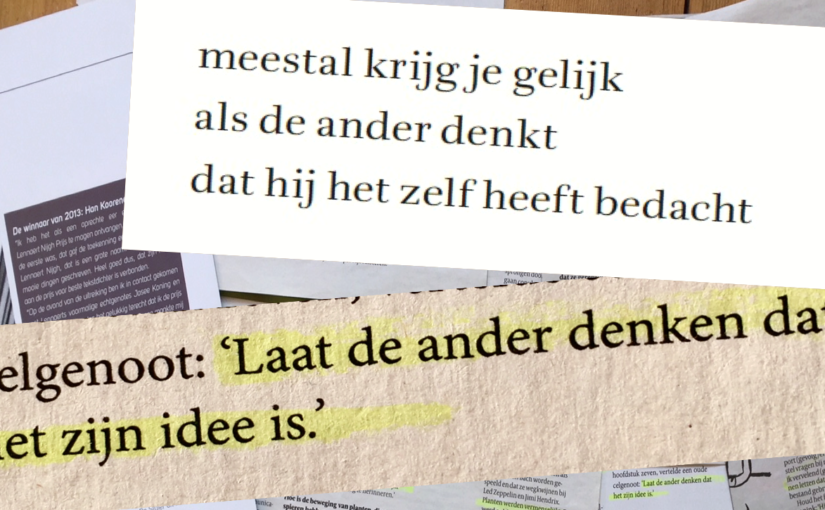 Dichter en kinderboekenschrijver Hans Hagen heeft bij het schrijven van zijn bundel Onbreekbaar ook regels gebruikt uit kranten en tijdschriften. Zie hiervoor de afbeelding. Een gevangene zei in een interview: “Laat de ander denken dat het zijn idee is.” Boven het citaat zie je hoe deze zin terecht kwam in het gedicht ‘Klas’. Wil je het hele gedicht lezen? Zoek op de boekenplank van de leesbevorderingscampagne De Weddenschap naar de gedichtenbundel en leen het in de bibliotheek.